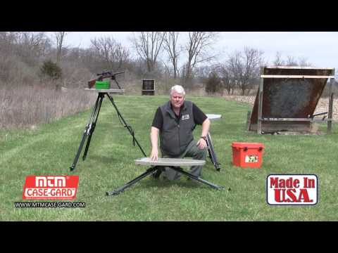The High-Low Shooting table is a true in the field shooting table. It can be set up where no table could set before. The secret lies in the tripod design which allows it work on uneven ground, gravel, grass, hillsides, etc.. Independently adjustable legs lock securely into place via twin locks systems per leg. Stake-style steel feet that feature side stirrups for easy leveraging into the ground offering a firm hold just about anywhere nature takes you. Although not designed for hard surfaces like blacktop and concrete, they work well in a carpeted hunting blind. The High-Low’s degree of adjustability is unmatched – from a low 18 inches to a whopping 55 inches off the ground – set it as high or low as suits your need. Shaped to accommodate both left and right handed shooters, the bench-style, table surface measures an ample 17 x 33 inches and will easily hold a front and back rest, ammo and other necessities. Transport is a cinch with a molded in tabletop handle and convenient tripod shoulder strap for carrying over longer distances. Made with USA and global parts.