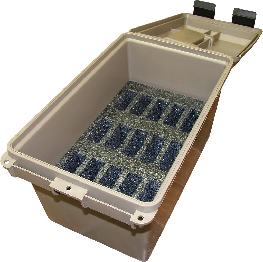 Always ready for quick transport, Tactical Mag Cans offer a protected method of storage for loaded magazines. Each mag is individually secured with ridged precut military grade foam padding to prevent bumping, sliding and scratching. Each box shuts tight with an O-ring seal and solid latching system. Dual latches give better sealing and prevent accidental openings. Security tabbed for three padlocks. Molded-in stacking ridges for slip resistant stacking. Comfortable handle for when you're bugging out. Tactical Gun owners can rest assured knowing their cache is protected inside MTM Mag Cans.