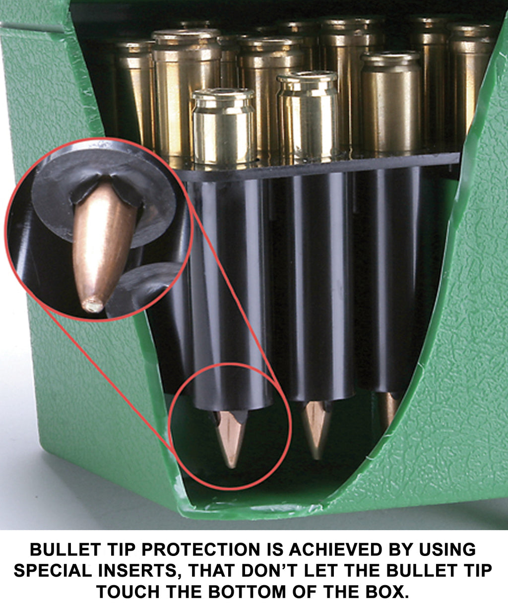 Bullets are placed in the box in the down position and are protected by four special fingers. These fingers are designed to keep most bullet tips from hitting the bottom of the box, preventing tip damage that can change bullet flight characteristics.