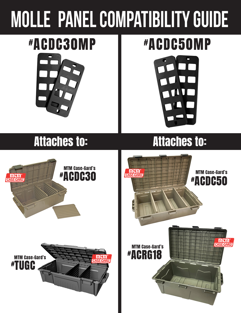 Turn the inside of your ACDC lid into valuable, customizable storage space with MTM’s MOLLE Panel Kits. Designed to f it the ACDC30 and ACDC50, these panels let you attach pouches, tools, and accessories—keeping gear off the bottom of the crate and right where you need it.